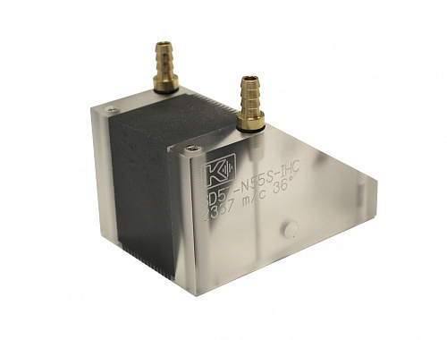 Призма наклонная для поперечных волн с номинальным углов ввода 55 градусов. Для механизированного и автоматизированного контроля, со штуцерами подачи жидкости.